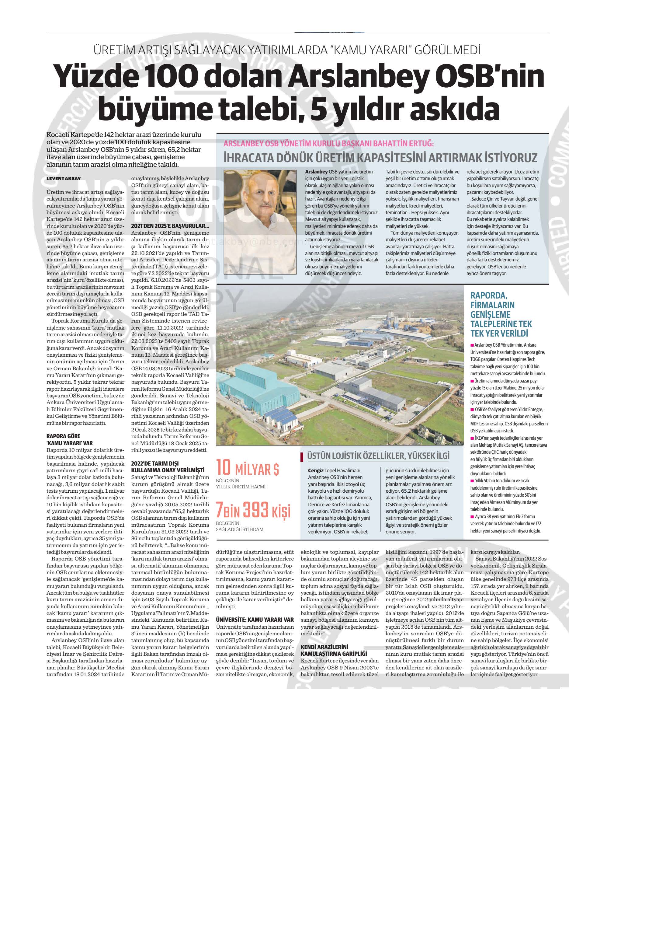 Üretim ve ihracat artışı sağlayacak yatırımlarda ‘kamu yararı’ görülmeyince Arslanbey OSB’nin büyümesi askıya alındı. Kocaeli Kartepe’de 142 hektar arazi üzerinde kurulu olan ve 2020’de yüzde 100 doluluk kapasitesine ulaşan Arslanbey OSB’nin 5 yıldır süren, 65,2 hektar ilave alan üzerinde büyüme çabası, genişleme alanının tarım arazisi olma niteliğine takıldı. Buna karşın genişleme alanındaki ‘mutlak tarım arazisi’nin ‘kuru’ özellikte olması, bu tür tarım arazilerinin mevzuat gereği tarım dışı amaçlarla kullanılmasının mümkün olması, OSB yönetiminin büyüme heyecanını sürdürmesine yol açtı.