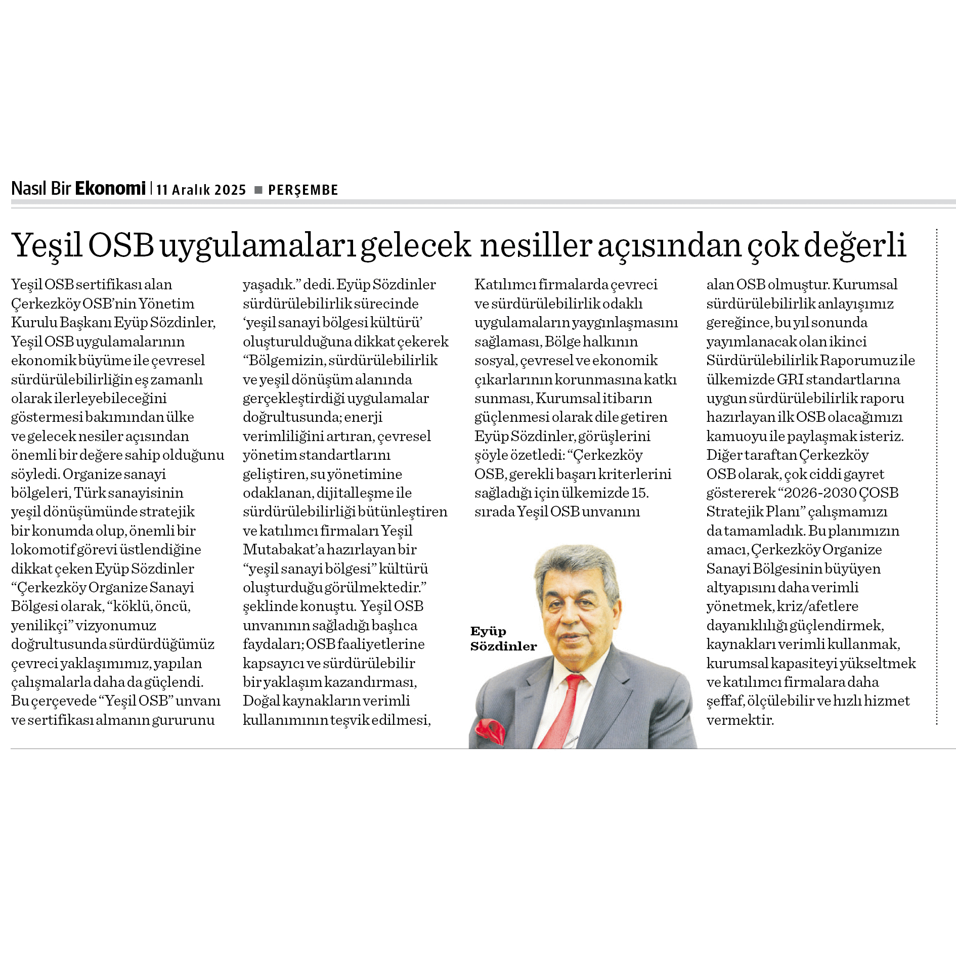 Yeşil OSB sertifikası alan Çerkezköy OSB’nin Yönetim Kurulu Başkanı Eyüp Sözdinler, Yeşil OSB uygulamalarının ekonomik büyüme ile çevresel sürdürülebilirliğin eş zamanlı olarak ilerleyebileceğini göstermesi bakımından ülke ve gelecek nesiler açısından önemli bir değere sahip olduğunu söyledi.