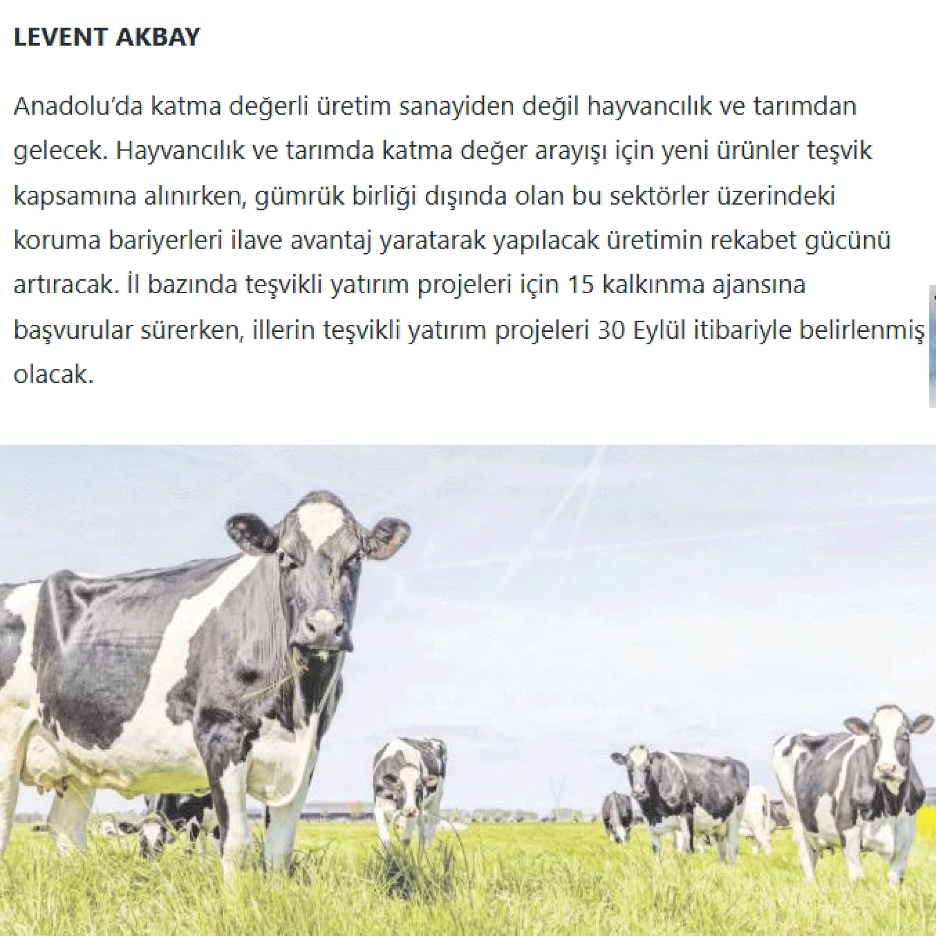 Anadolu’da katma değerli üretim sanayiden değil hayvancılık ve tarımdan gelecek. Hayvancılık ve tarımda katma değer arayışı için yeni ürünler teşvik kapsamına alınırken, gümrük birliği dışında olan bu sektörler üzerindeki koruma bariyerleri ilave avantaj yaratarak yapılacak üretimin rekabet gücünü artıracak. İl bazında teşvikli yatırım projeleri için 15 kalkınma ajansına başvurular sürerken, illerin teşvikli yatırım projeleri 30 Eylül itibariyle belirlenmiş olacak.